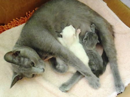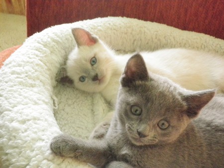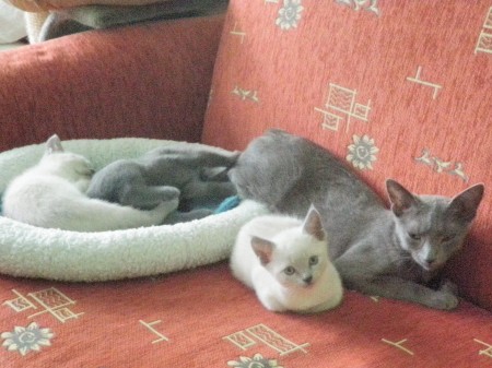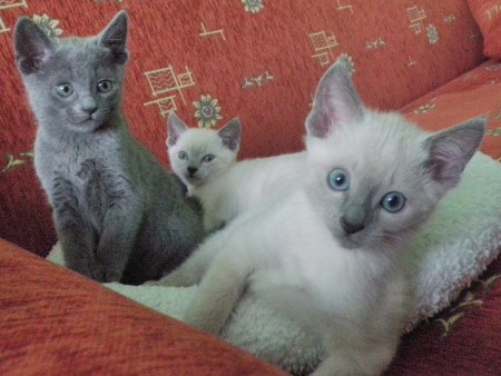 Ruská modrá kočička Bella, Ruská bílá s odznaky kočička Bibiana a kocourek Bisou (Bišou).